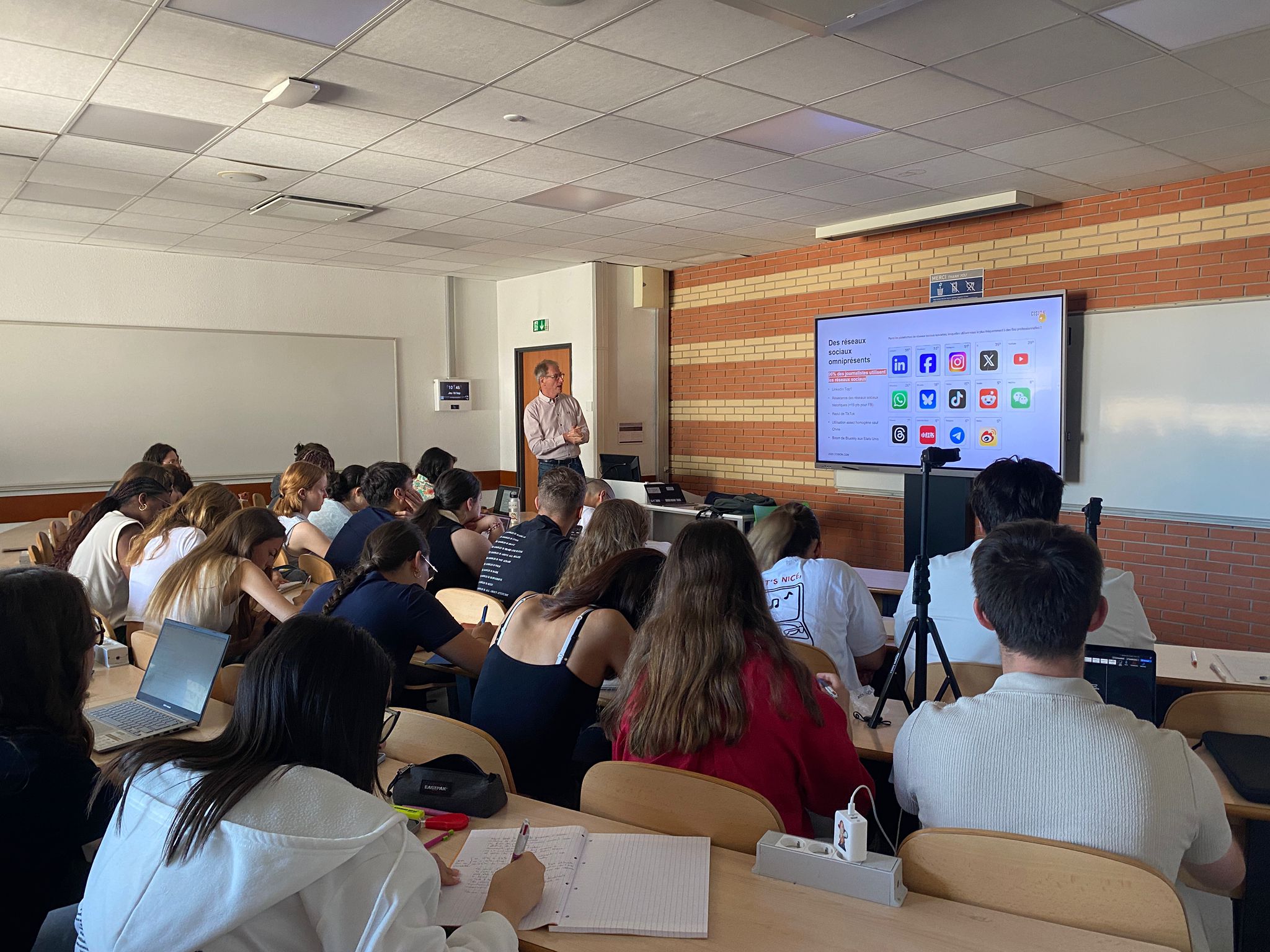 Dans le cadre du tour e-media 2025, nous avons eu la chance de recevoir Fréderic Dumas sur le campus. Fort de 25 ans d’expérience dans le secteur du marketing, il a connu plusieurs expériences durant sa carrière, il est l’actuel co-président d’Adetem mais aussi vice-président des ventes, du marketing et de l’expérience client chez Cision, de plus, il a occupé pendant un temps le poste de directeur des ventes en France chez Vocus.